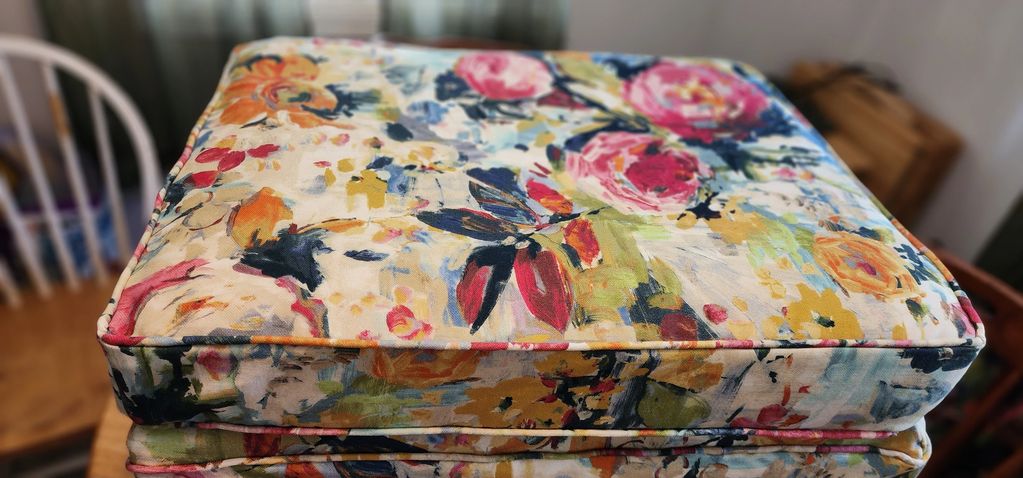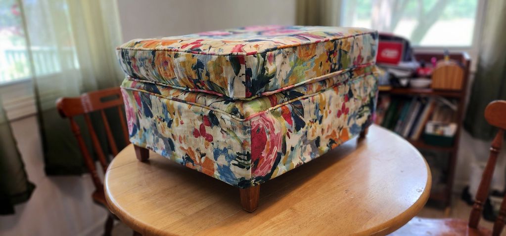Ottoman with floral print reaphostered for a client. New piping and fitted skirt