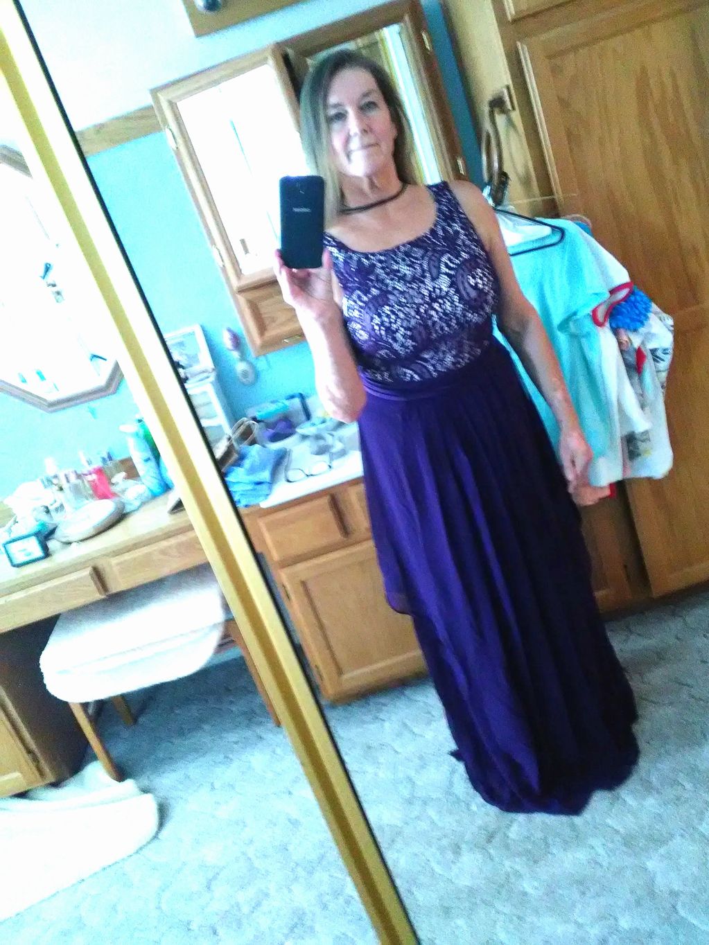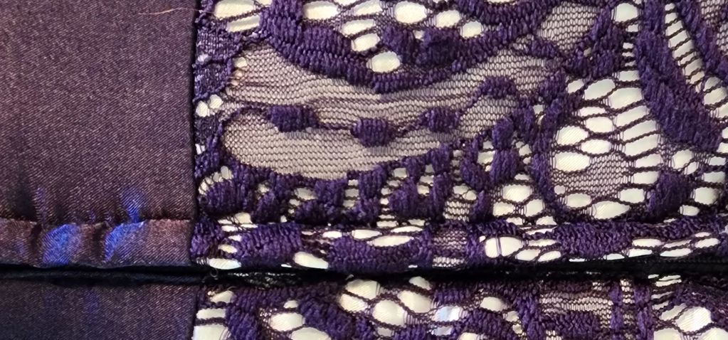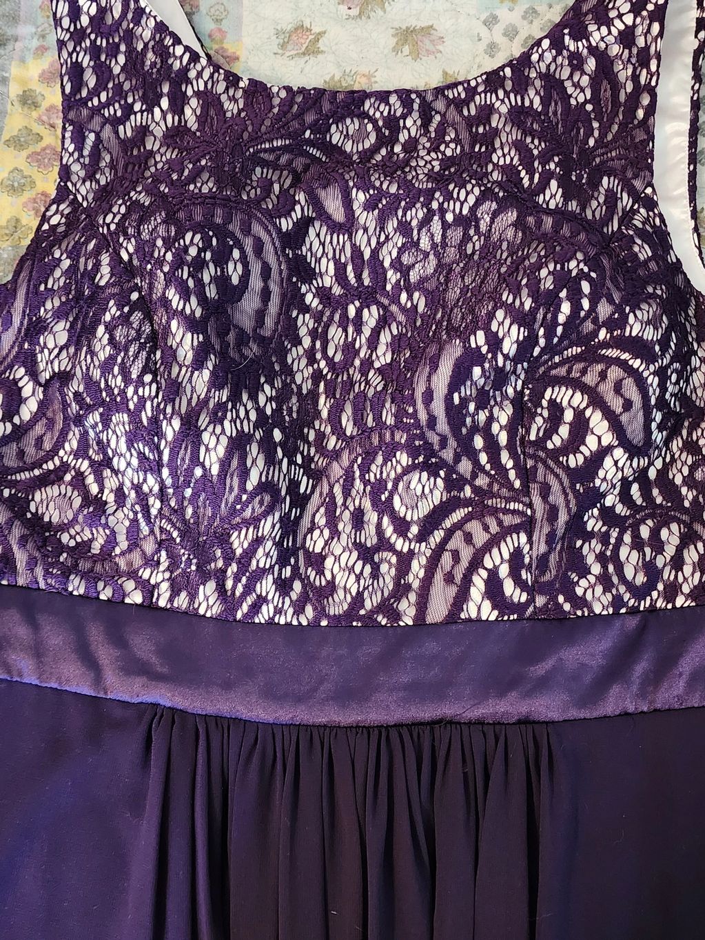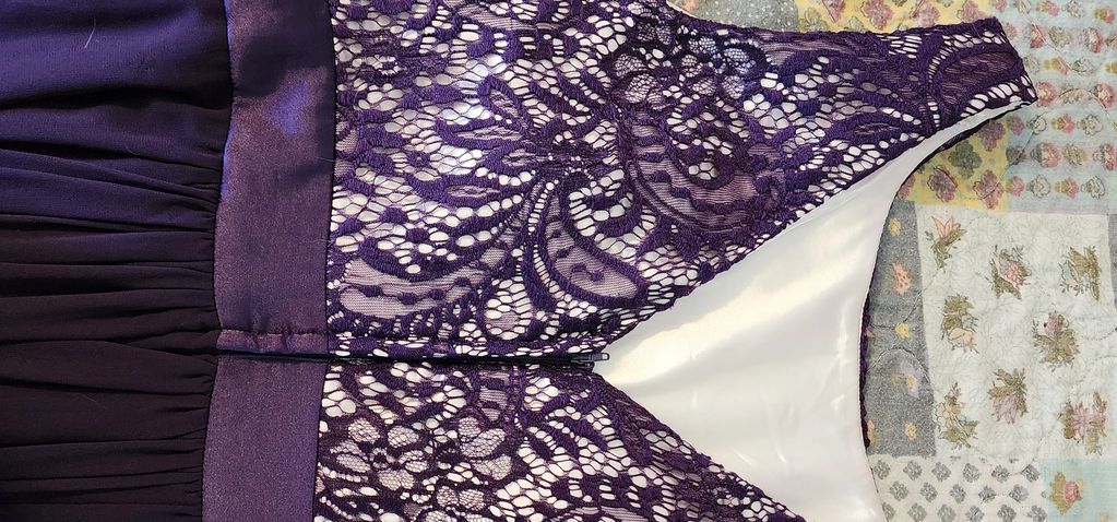 Polyester deep purple evening gown I made from a pattern. Skirt is slightly pleated with a sheer polyester "apron" over polished polyester skirt. Fitted sleeveless bodice is purple lace over Ecru sateen fabric. Lined in sateen. Has a satin belt around to the back. Took me 2 weeks to make this for a convention Gala I attended.