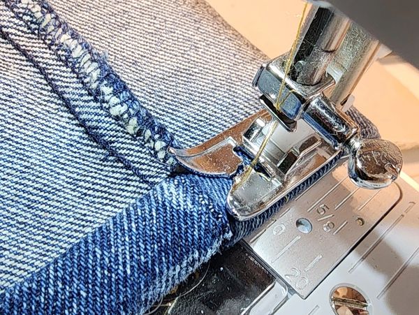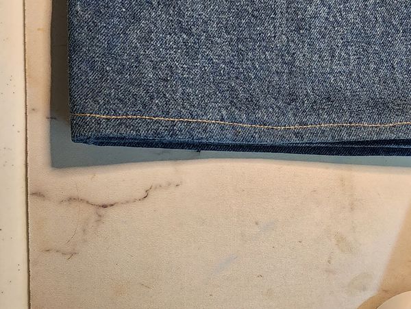close up view up stitches on the new hem of the Carhart jeans. Perfect stitching! was 2 pair of jeans, completed them in 1 day.