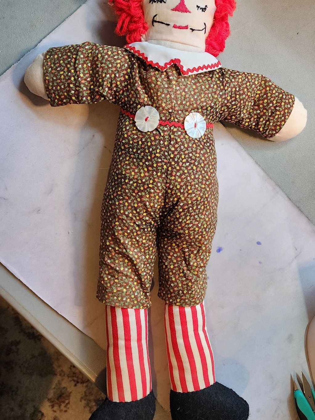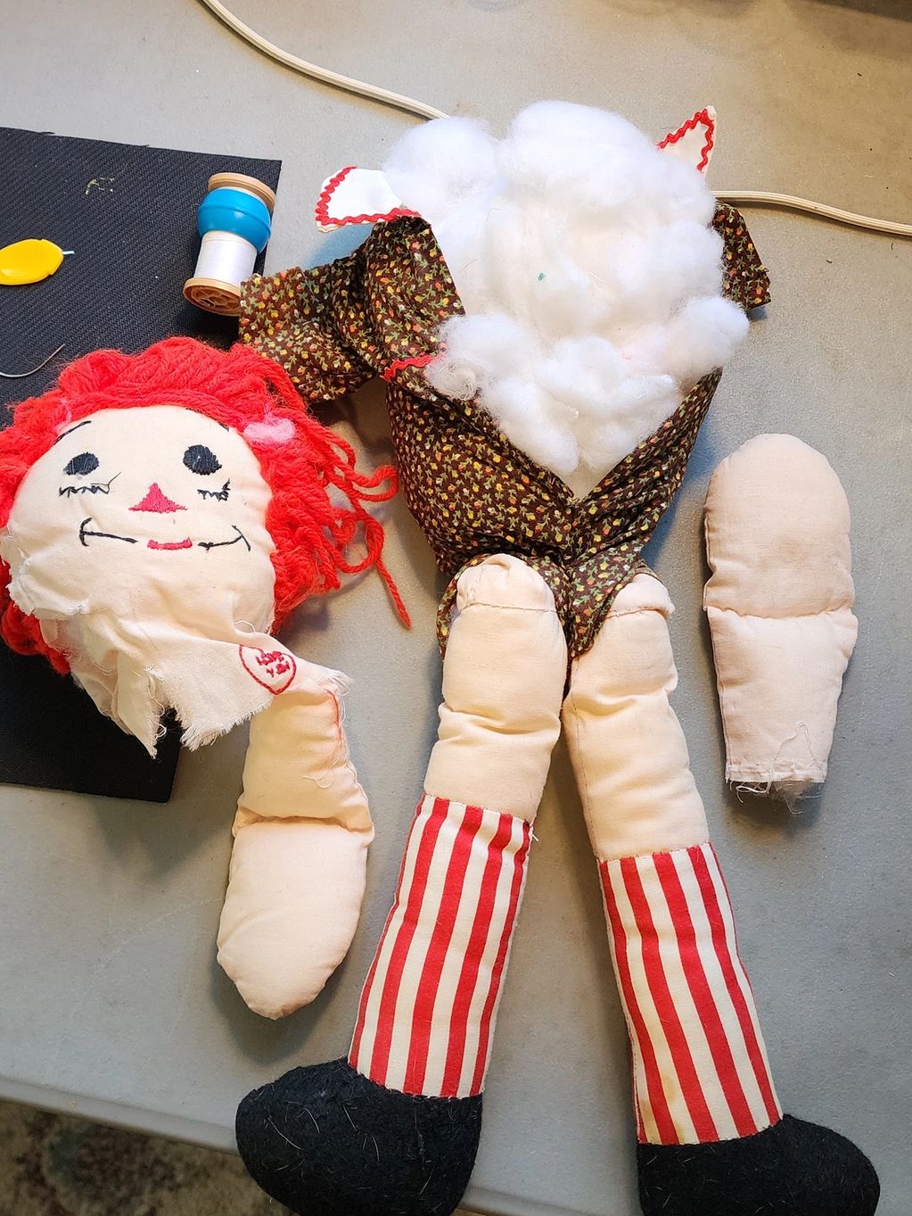 Poor Raggedy Andy was torn apart by a playful puppy. Was in critical condition. He was rushed into surgery & repaired good as new.