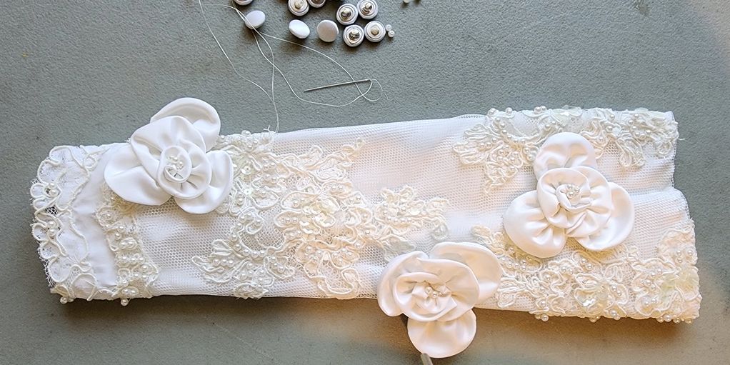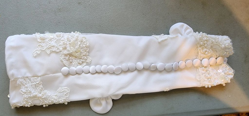 Made this "Bouquetiers" (bridal flower holder) for a client for her wedding out of her mothers & grandmothers wedding gowns. It has the lining and roses from her grandmothers gown and the outer tulle with applique, pearl beads & buttons are from her mothers gown. She LOVED it! All hand made, hand sewn. Then roses are hand twisted ribbon formed into a rose, then sewn on. I also sewed little pearl