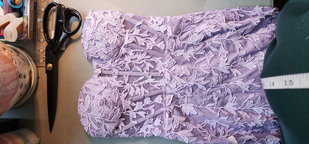 Lavender sequined beaded gown I remade the bodice turning it into a corset like bodice. I had to remove it from the skirt part of the gown so I could put in the "bones". Then reattach the entire bodice to the skirt part.