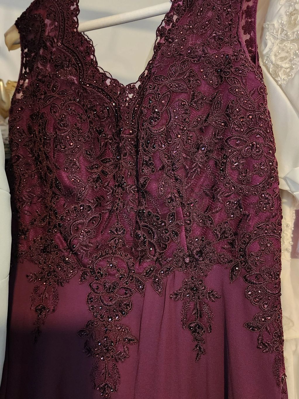 Beautiful Plum beaded mother of the groom gown. Closed the cleavage split in the front of the bodice, & opened the arm holes a bit. Beautiful gown, but those plum beads!! My needles hated them......But the owner loved her gown!