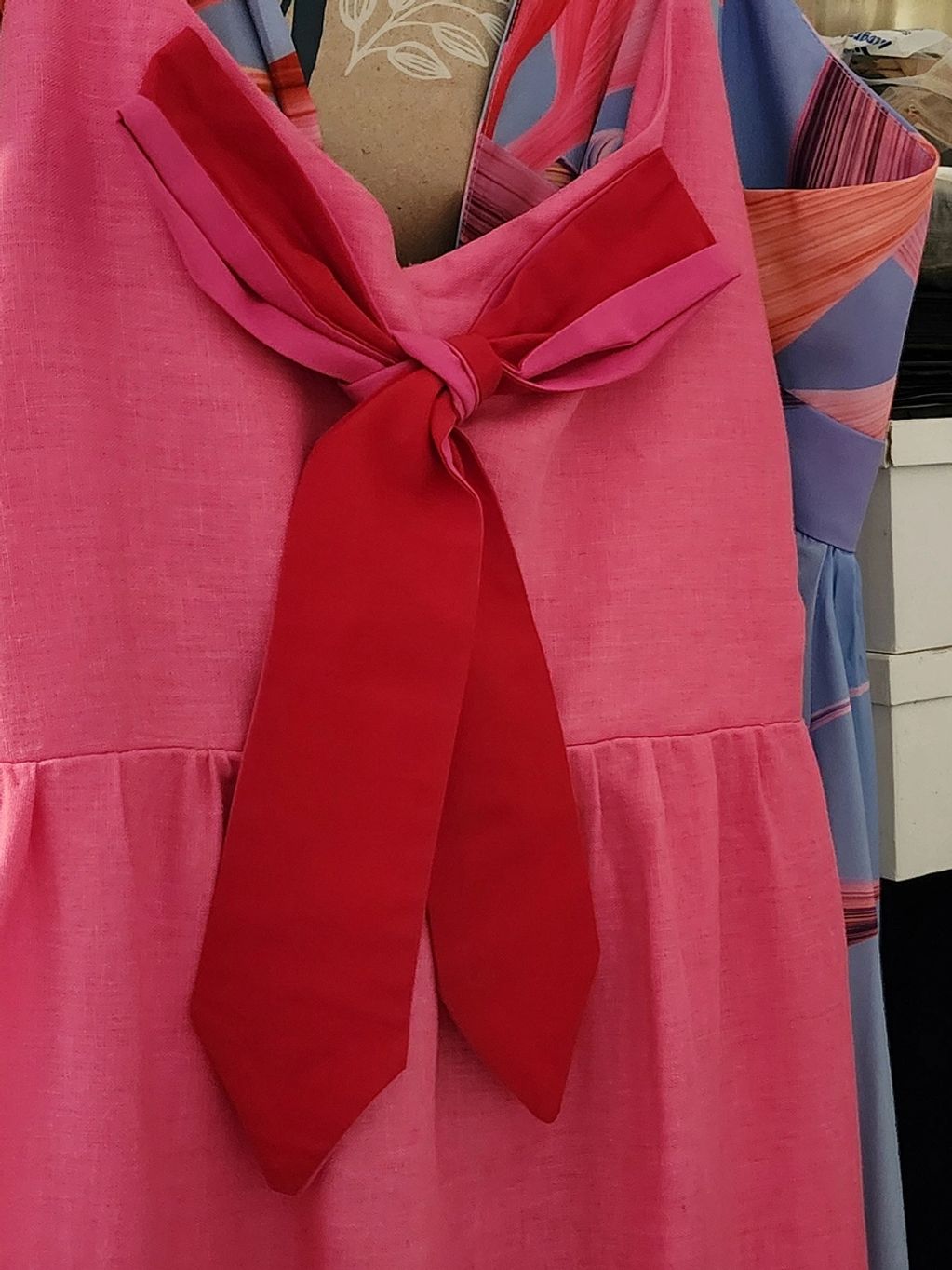 A pretty multicolored bow for a pink dress. Hand made from scrapsof fabric. So pretty!!