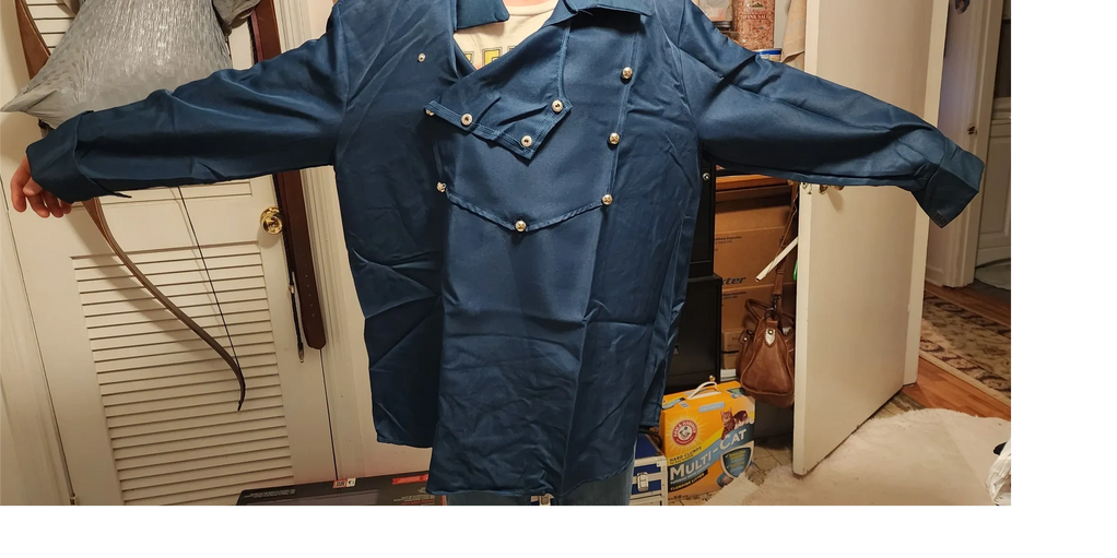 Halloween western shirt was way to big for this young man. I took it in 4 inches each side seam and shortened the sleeves. 1 day to finish
