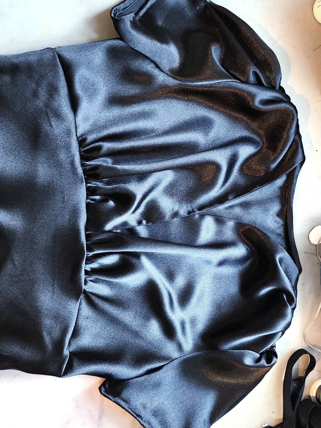 Black satin dress I made from a pattern for a client. It had a wrapped gathered bodice with short sleeves gathered at the top & lined with the same type of fabric. It was floor length. took me a week to make it.