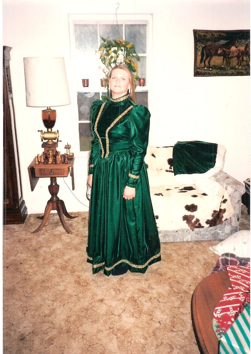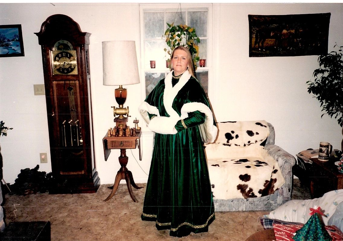 Matching shawl and hand muff for emerald green gown above. Made with same velvet fabric lined with white sateen fabric with faux fir trimmed. Hand muff is all faux fur and lined with same sateen fabric. A matching set. This outfit was so warm . Virginia winters are COLD. This was for a Christmas event